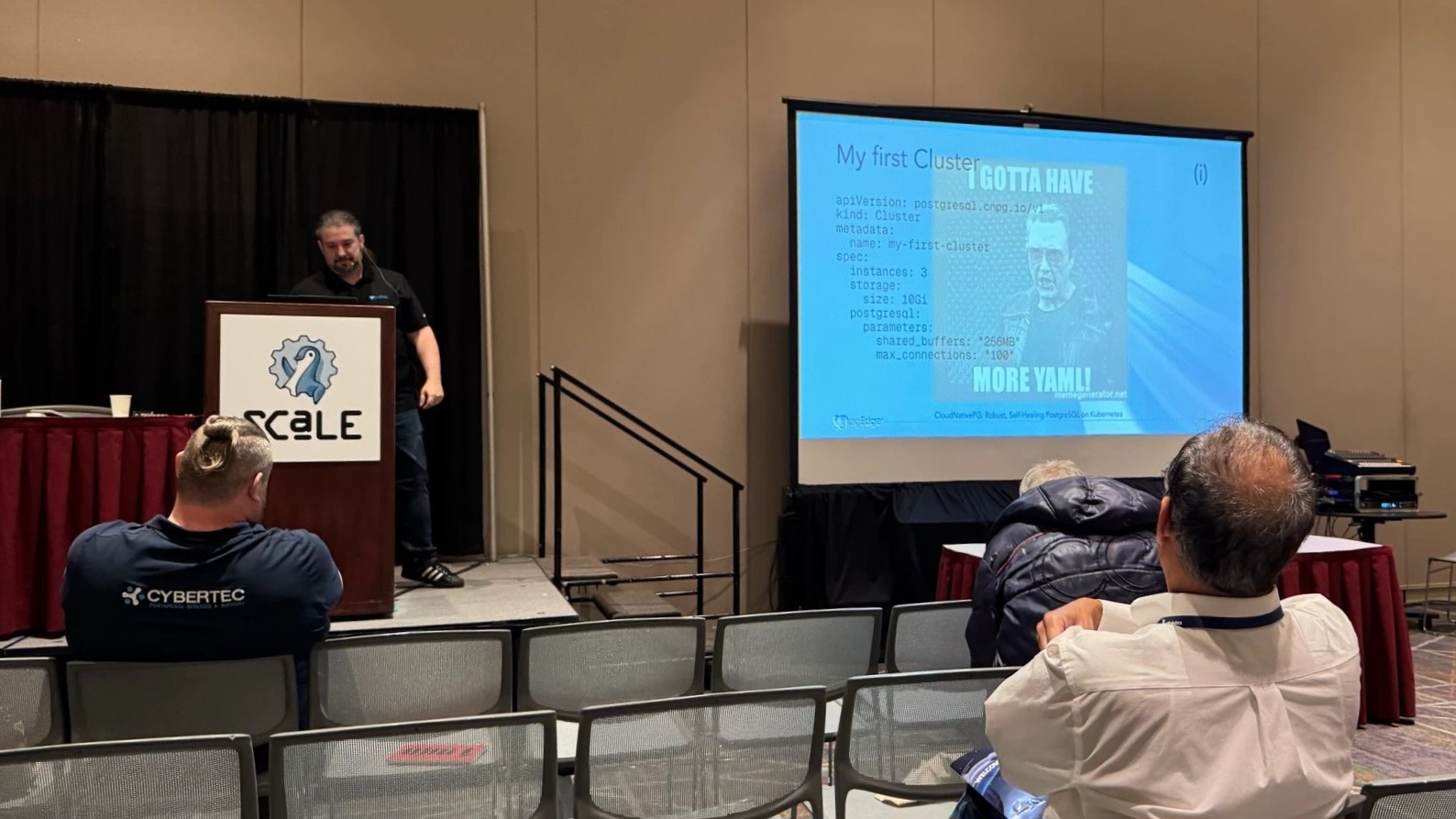 Great slide transition as Jimmy is presenting CloudNativePG at SCaLE 23x. Many thanks to Josh Lee for the photo!